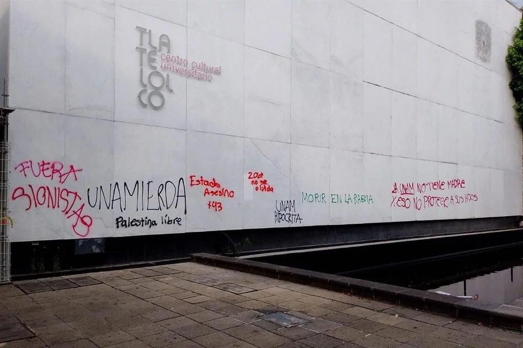 Esta tarde, las agresiones nuevamente se enfocaron contra la cultura y la memoria, pues atacaron las instalaciones del Centro Cultural Universitario Tlatelolco (CCUT), rompieron los cristales del acceso principal y dañaron el primer piso, arrojando objetos explosivos que causaron afectaciones menores.